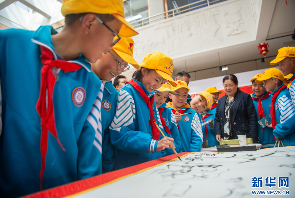 4月9日,拉薩市城關區雪小學學生在西藏自治區圖書館讀書活動現場體驗書法。新華網 旦增努布 攝