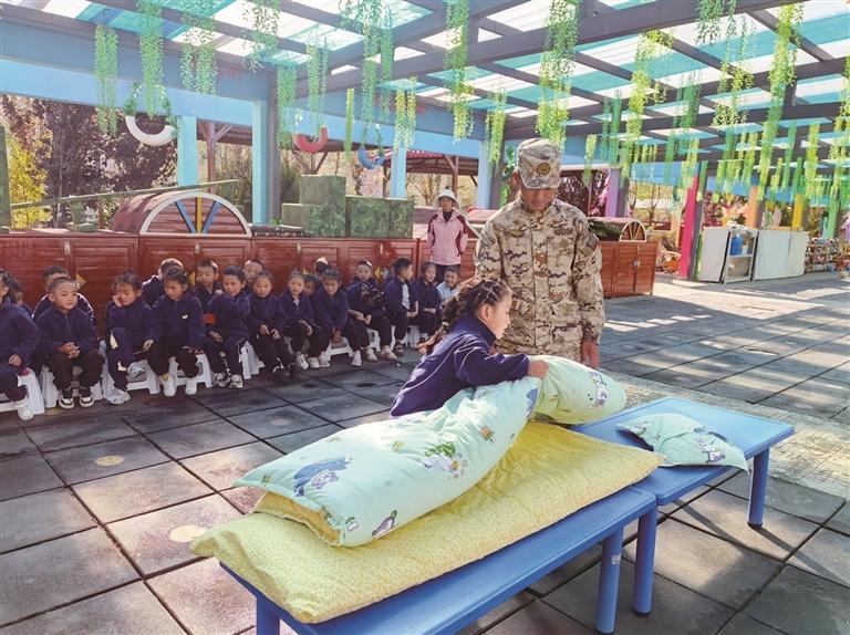 活動期間,幼兒園設置相關體驗環節,幼兒身著迷你迷彩服,在退役軍人指導下學習立正、稍息等軍姿,參與爬平衡木、鉆“戰壕”等模擬訓練。教室內,教師通過繪本講述邊疆軍人故事,用動畫展示國旗與軍艦;手工區中,幼兒將制作的五角星、繪制的軍艦等作品,張貼于“國防心愿墻”。