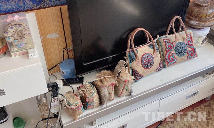 居家的員工們各自縫制著牛皮包、帽子、小掛件等藏族傳統物件,裁片、組合、縫制……一道道工序在他們勤勞的雙手上有條不紊地進行著。