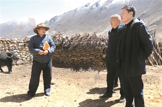 4月14日至15日,區黨委常委、拉薩市委書記白瑪旺堆深入林周縣開展脫貧攻堅調研督戰工作。圖為白瑪旺堆來到林周縣旁多鄉達龍村,向村里工作人員了解村民脫貧增收、牦牛養殖等情況。