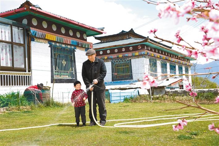 圖為巴宜區米瑞鄉通麥村村民扎西格勒在自家庭院給草坪灑水。見習記者 胡文 攝