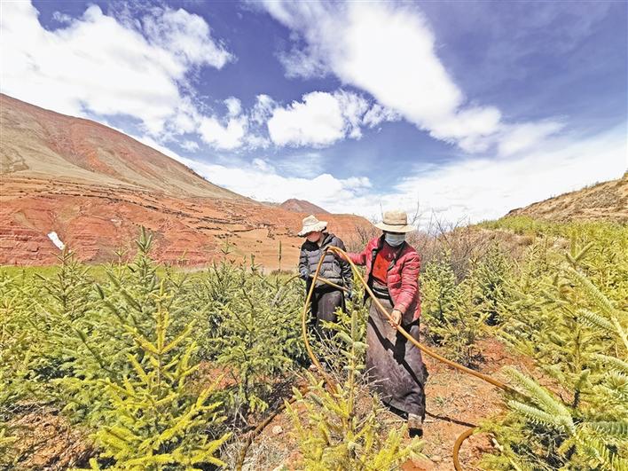 西藏昌都市丁青縣覺恩鄉(xiāng)絨通村苗木種植項(xiàng)目總投資2000萬(wàn)元,采取“公司+基地+農(nóng)戶”的運(yùn)作模式。2018年底,基地開工建設(shè),93戶農(nóng)戶以每畝每年1000元的價(jià)格參與500畝的土地流轉(zhuǎn),項(xiàng)目實(shí)施階段共計(jì)880人次的貧困戶參與了務(wù)工。至2019年6月,已成功栽下云杉、昌都楊、柳樹、榆樹4個(gè)品種,共計(jì)97萬(wàn)株樹苗。目前,在基地長(zhǎng)期務(wù)工的村民有8名,年收入近2萬(wàn)元。