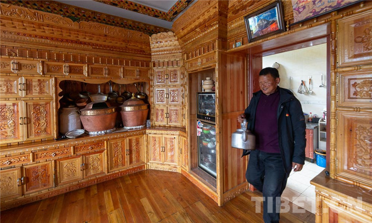 來到村民仁青家里,仁青正在煤氣灶上燒水?!捌綍r自己在工地上開裝載機,現在家庭年收入10多萬元?!闭勂瓞F在的生活仁青開興地說,以前只有過年才可能吃到的大米,現在已經是每家每戶的家庭便飯。