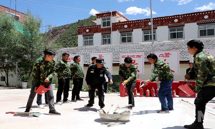 中國西藏網訊 “拔下保險銷,讓噴嘴對準火焰根部……”46歲的尼瑪一邊講解一邊演示滅火器使用方法和注意事項,身邊幾位穿著迷彩服的學員正認真觀察并模仿著。