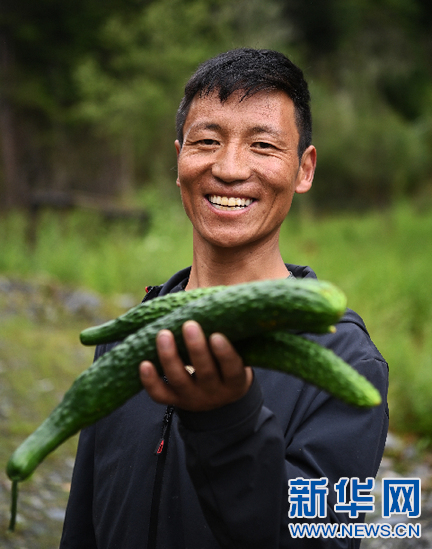 7月30日,當地群眾展示大棚里采摘的黃瓜,這些蔬菜將通過供銷社銷往各地。新華社記者 普布扎西 攝