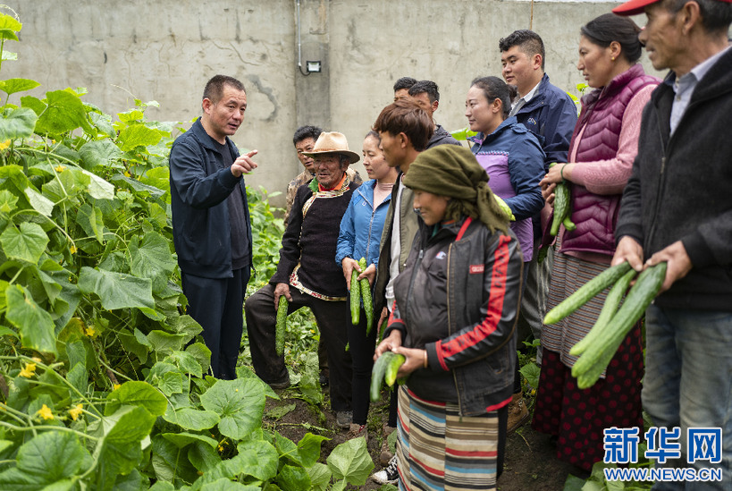 7月30日,西藏自治區供銷合作社社有企業負責人趙全(左一)給當地群眾講解蔬菜種植知識。新華社記者 普布扎西 攝
