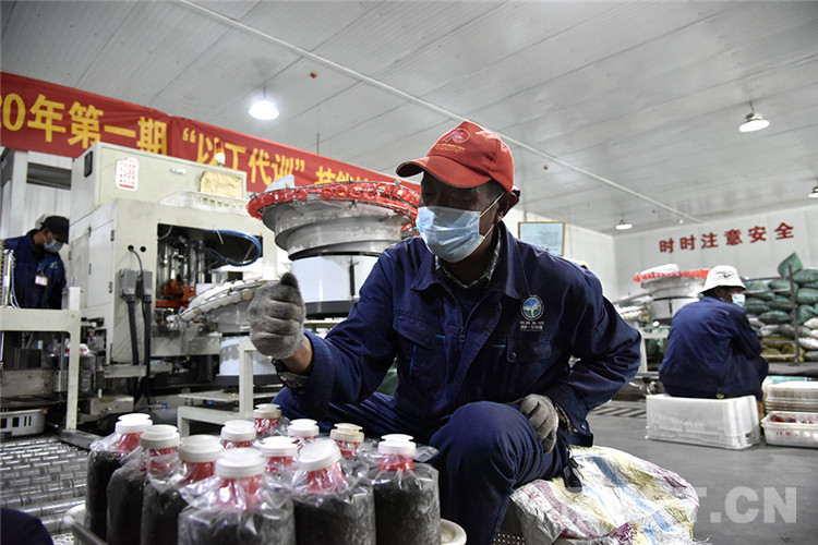圖為日喀則市珠峰一見則喜生物科技示范園區裝袋車間里工人正在裝袋 攝影:王媛媛