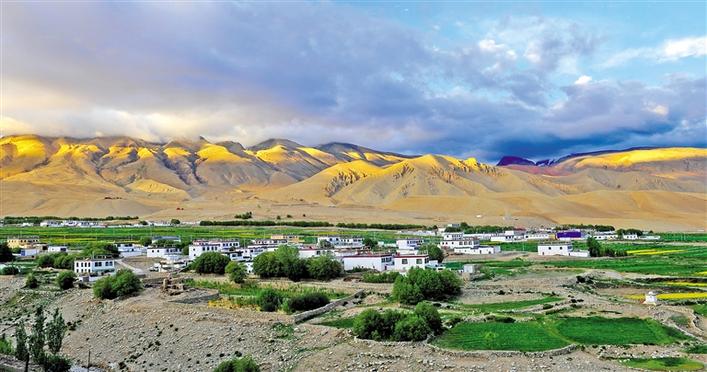 順著巍巍納木那尼山腳一路向著南方前行,幾經盤旋,快到普蘭縣城之際,在蒼茫的雪山和險峻的河谷間,一大片平整的坡地映入了眼簾。坡地上潔白的屋舍、綠色的青稞、成片的樹林,還有黃色的油菜花構成了一幅仿佛油畫的田園美景。