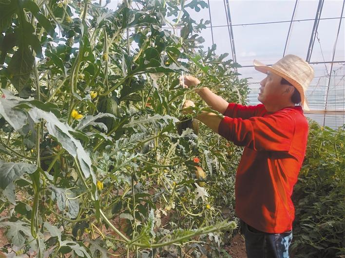 圖為在拉薩國家農業(yè)科技示范園區(qū)里,菜農李先生在給種植的西瓜套網(wǎng)袋。記者 李梅英 攝