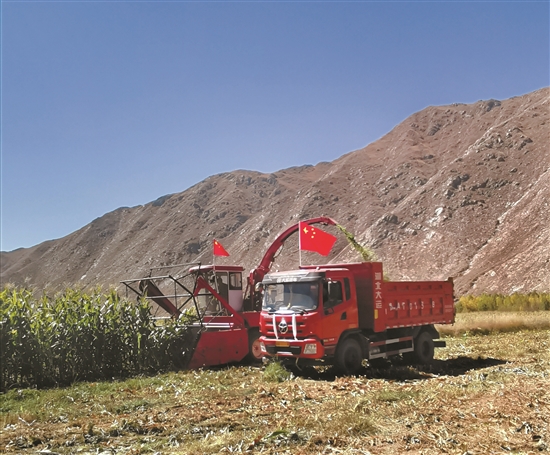 上午11時,收割工作緊張有序進行,多臺青貯收割機開足馬力在田地里奔忙。在齒輪的旋轉下,青貯玉米自動收割、粉碎、裝進運輸車,空氣中混合著濃郁清新的草香味,到處是一派繁忙的收獲景象,這為全區牦牛越冬儲備下了充足的“口糧”。