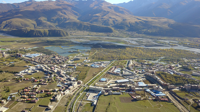 在甘孜州甘孜縣吉絨隆溝易地扶貧安置點,旁邊的十八軍窯洞遺址群展現著這里的紅色血脈。遠處雪山座座相連,不遠處縣城邊雅礱江河谷地帶,景色醉人。