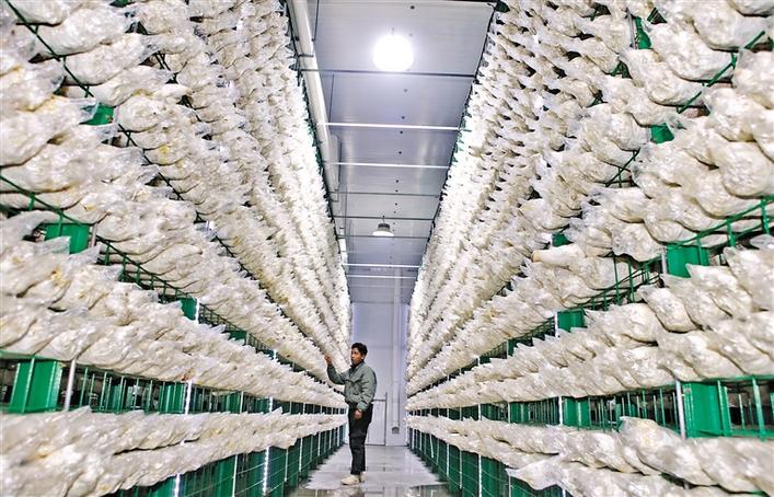 圖為園區工作人員查看食用菌長勢情況。記者 唐斌 次旺 攝