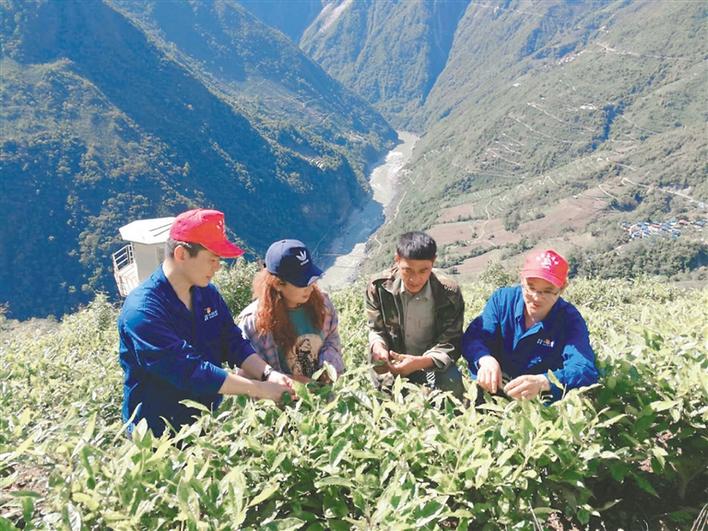 圖為華能雅江公司駐村干部與當地百姓一起查看茶葉長勢。記者 楊小娟 攝