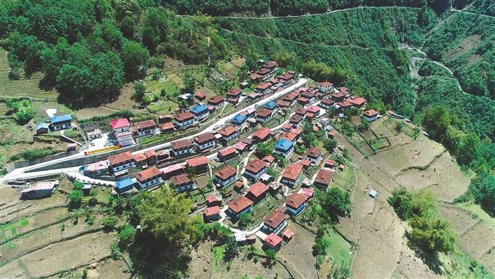 從公路上遠眺西藏自治區阿里地區日土縣日松鄉甲崗村,只見一大片紅檐白墻的兩層居民房矗立在綠中帶黃的草原上,家家戶戶屋頂都插著五星紅旗,迎風招展、格外鮮艷。