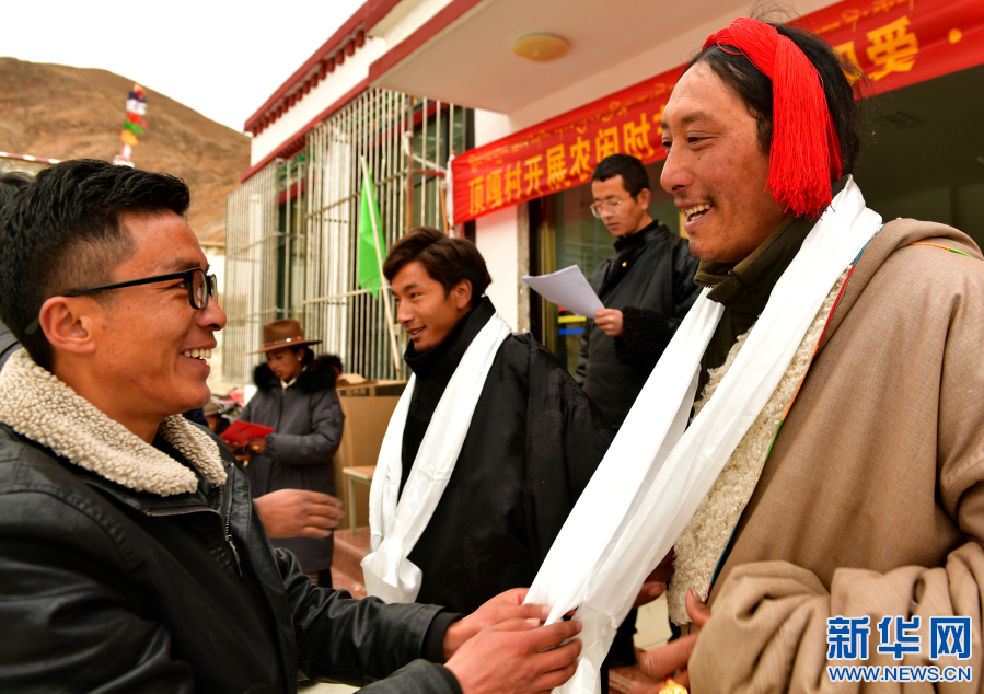 西藏拉薩市堆龍德慶區德慶鄉頂嘎村駐村第一書記扎西達杰(左)為參加文娛活動的獲獎村民頒獎并佩戴哈達(2019年2月28日攝)。新華社記者 張汝鋒 攝