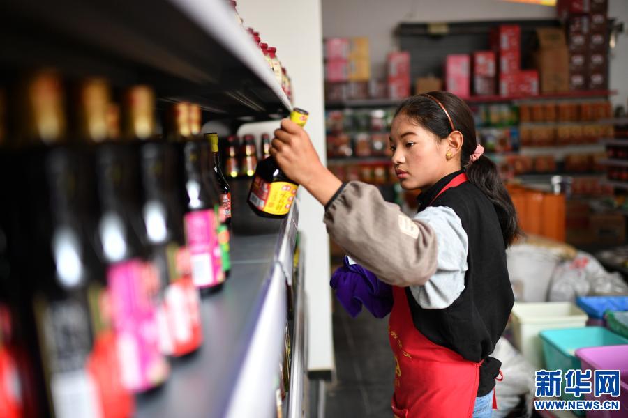 西藏昌都市丁青縣尺牘鎮烏巴村村民斯朗德吉在尺牘鎮的一家超市里打工(9月18日攝)。2018年,斯朗德吉和家人從烏巴村搬遷到尺牘鎮易地扶貧搬遷安置點,住進了寬敞明亮的新房子。斯朗德吉還就近在安置點附近的超市找到了工作,每個月有2000元的收入。新華社記者 詹彥 攝