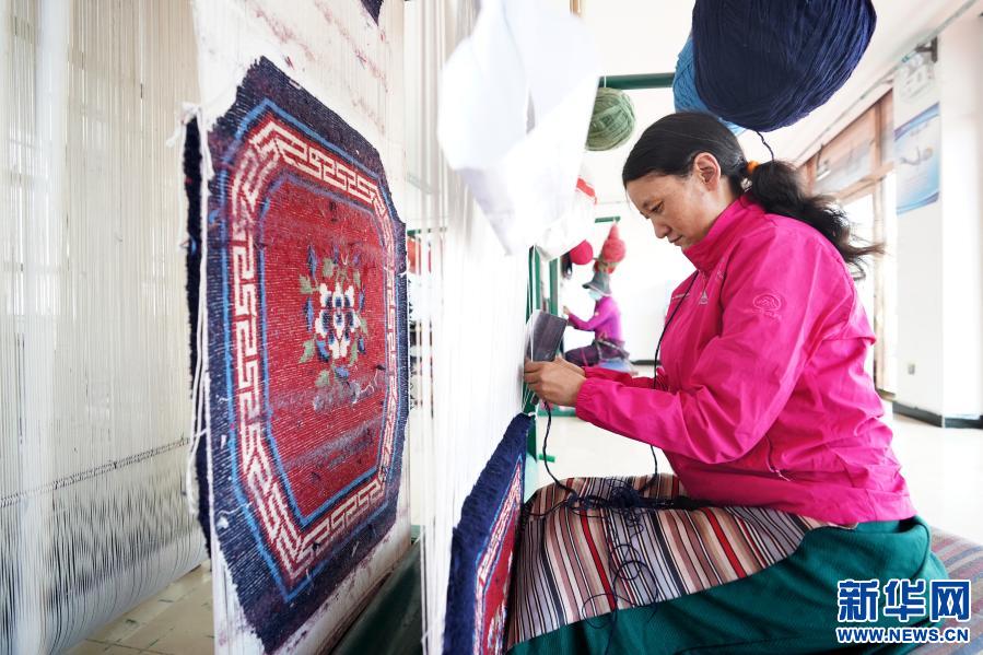 西藏阿里地區改則縣麻米鄉村民崗增在噶爾縣康樂新居服裝地毯加工廠里工作(7月25日攝)。2017年,崗增和家人搬遷到噶爾縣康樂新居易地扶貧搬遷安置點,住進了125平方米的新居。崗增還就近在安置點的服裝地毯加工廠找到了工作,每個月有3000元左右的收入。新華社記者 詹彥 攝