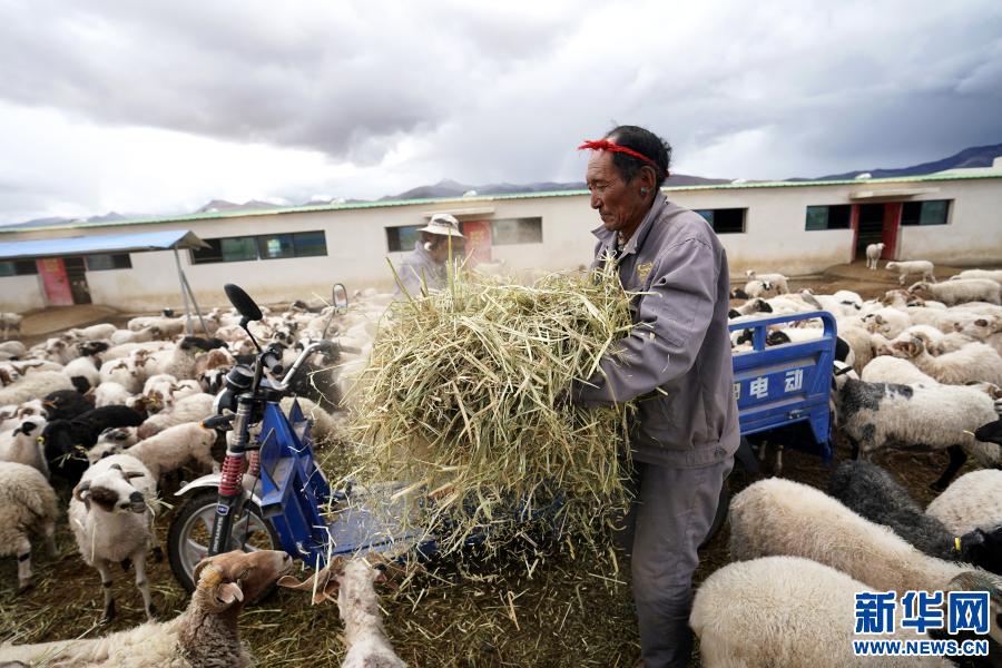 西藏日喀則市定日縣克瑪鄉幫布村村民頓珠在定日縣珠穆朗瑪崗巴羊規?;B殖產業園喂羊(7月31日攝)。頓珠2020年來到產業園打工,負責喂羊、打掃羊舍,每個月有3500元的收入。新華社記者 詹彥 攝