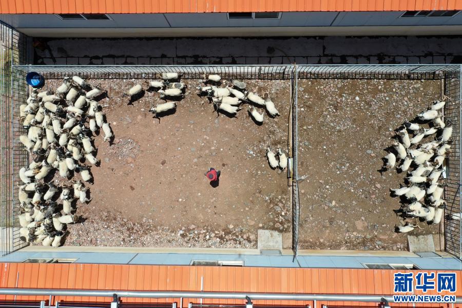 在西藏昌都市貢覺縣莫洛鎮阿旺綿羊繁育基地,阿果村村民色秋在查看綿羊的生長情況(5月2日攝,無人機照片)。2016年,色秋來到阿旺綿羊繁育基地打工,很快就學會了綿羊的養殖技術,現已成為繁育基地的一把好手,月工資漲到了4400元。新華社記者 詹彥 攝