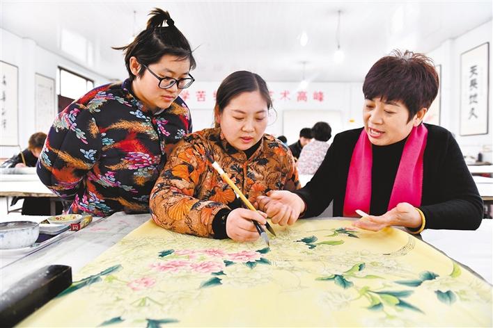 3月20日,工作人員在巨野縣魯西書畫院繪制工筆牡丹畫。新華社記者 郭緒雷 攝