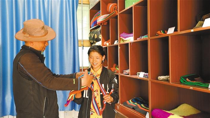 在措勤縣民族特色產業線下體驗館里,牧區傳統的韁繩、腰帶、靴子、馱包等手工藝品應有盡有。據了解,這些商品由群眾自制后交由阿云電子商務有限公司統一銷售,銷售收入將一分不少地返還給群眾。在這里上班脫貧戶頓珠上個月拿到了1800元的工資,其中包括400元的提成。