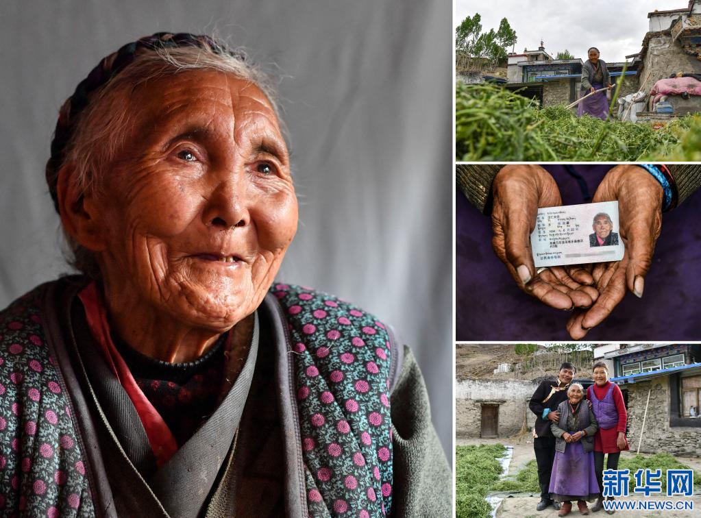 家住西藏山南市乃東區亞堆鄉曲德沃村的次仁央宗老人。左:次仁央宗老人的肖像。右上:次仁央宗老人在曬牧草。右中:次仁央宗老人的身份證。右下:次仁央宗和子女的合影。 新華社記者 晉美多吉6月3日攝
