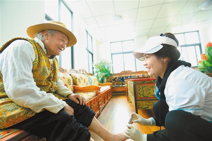 圖為拉薩市墨竹工卡縣特困人員集中供養服務中心的護理員在照料孤寡老人。洛克 記者 潘多 攝