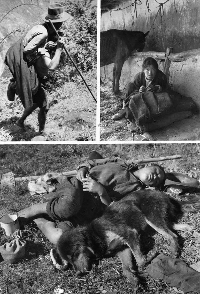 上圖左:西藏農奴制度下的“人背人”(即農奴像牲畜一樣背馱著農奴主)差役。上圖右:和牲口同住的農奴。下圖:農奴服勞役后與犬同眠(資料照片)。