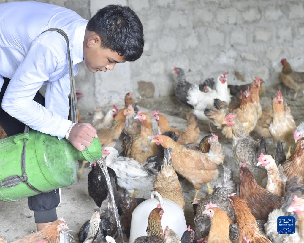 9月15日,西藏定結縣陳塘鎮養雞場工作人員扎旺給藏雞喂水。新華社發(索朗羅布 攝)