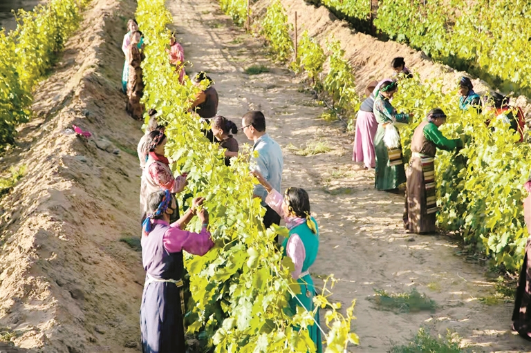 圖為曲水才納凈土健康產業園內,當地農牧民群眾正在葡萄種植基地內忙碌。 拉薩融媒記者 王 雪攝