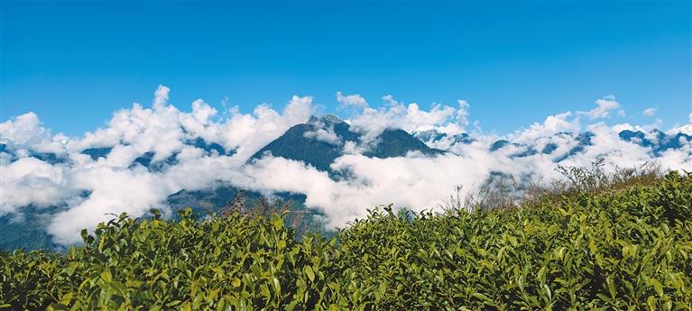 云霧縹緲、雪山環(huán)繞的格林村百畝茶園。本報記者 高玉潔 攝