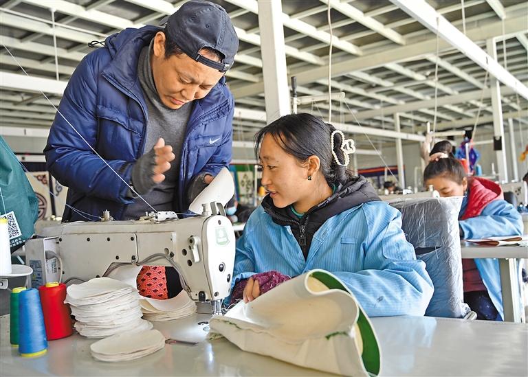 圖為西藏古傳民族手工業有限公司的老師在教授學員縫紉技巧。記者 洛桑 攝