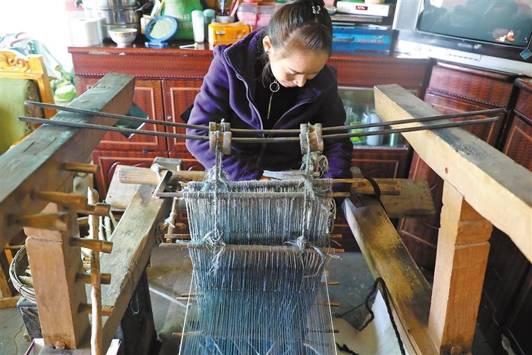 圖為山南市措美縣卓德村村民德吉措姆在務工返鄉期間編織毛毯。白瑪頓珠 攝
