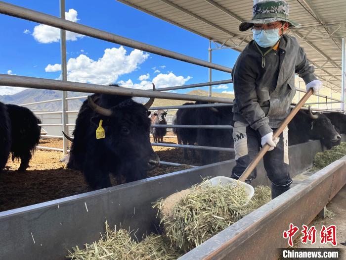 圖為拉薩市林周縣格桑塘現(xiàn)代農(nóng)牧業(yè)產(chǎn)業(yè)示范園內(nèi),工作人員為牦牛準(zhǔn)備飼料。 冉文娟 攝