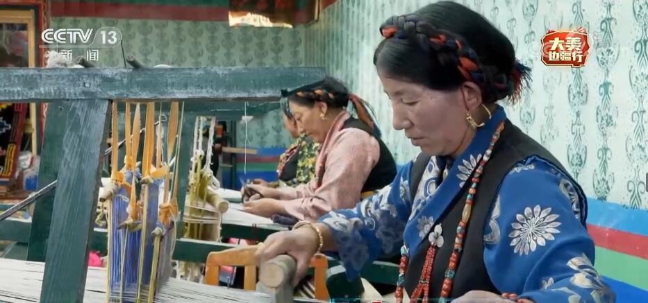 崗巴縣崗姆沖農(nóng)民專業(yè)合作社負責人 央拉姆:我們這里有卡墊、靠背、氆氌、邦典。這個叫邦典,我們就這樣戴的。