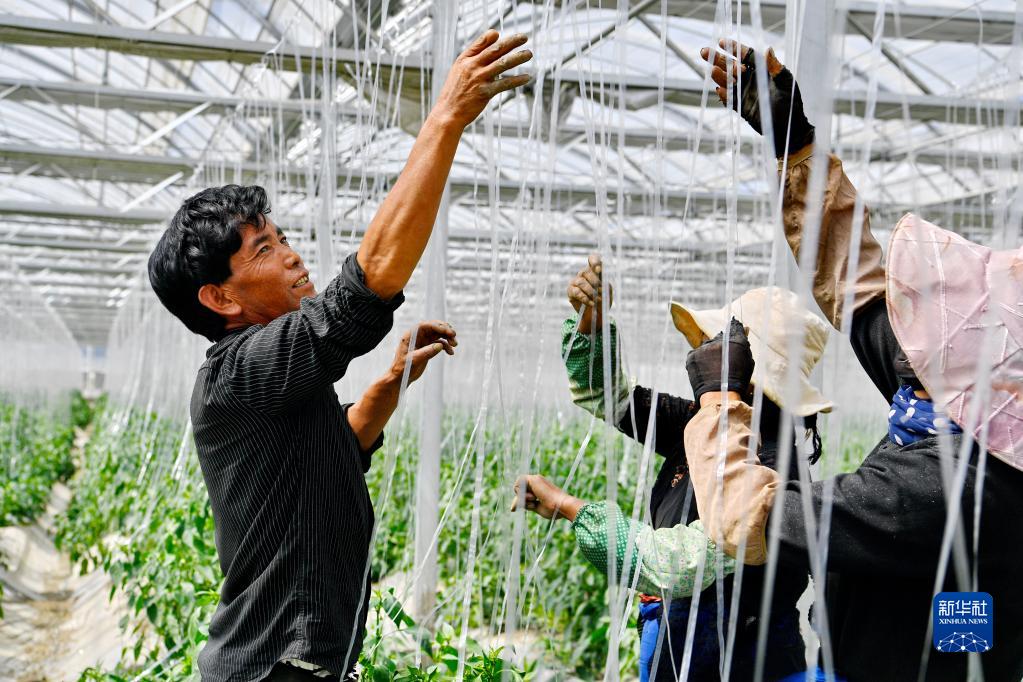 戴著遮陽帽,一邊修剪辣椒枝條,一邊系繩吊枝,兩三人搭檔,有說有笑。這是記者在西藏山南市瓊結縣千畝蔬菜基地看到的場景。