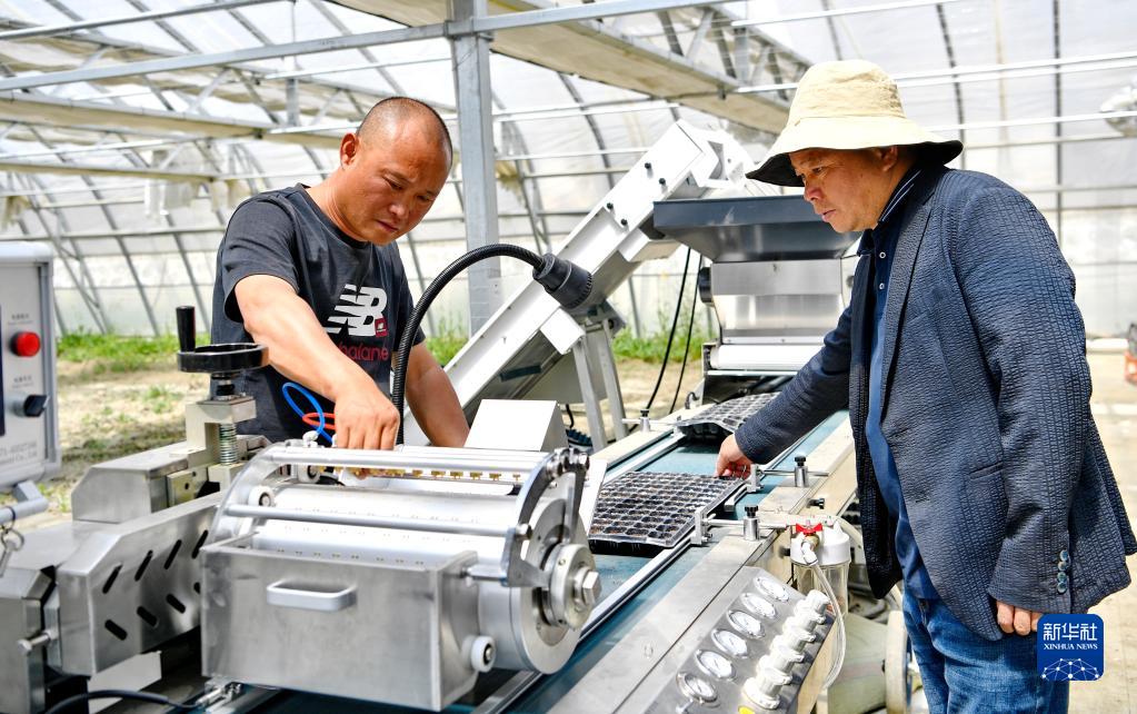 7月11日,在瓊結縣千畝蔬菜基地育苗大棚內,基地負責人管大鵬(右)和技術人員正在調試播種流水線。新華社記者 張汝鋒 攝