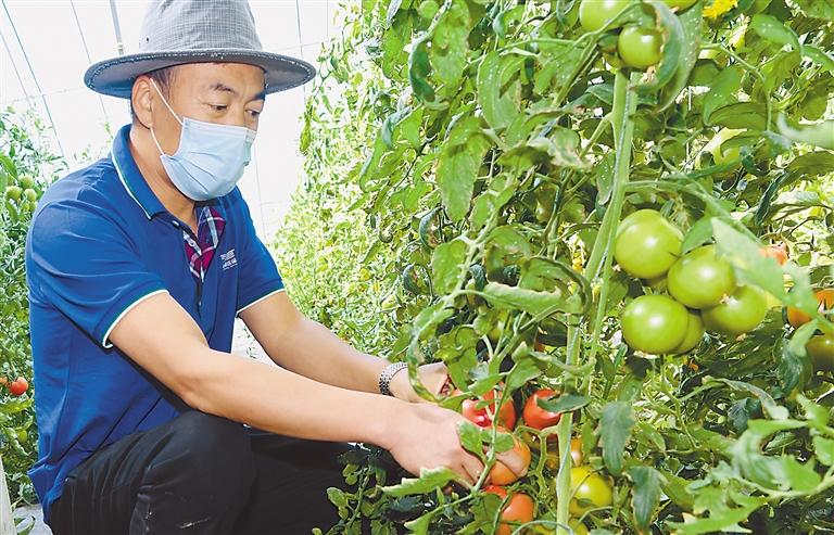 圖為日喀則市白朗縣七彩莊園生態農業公司工作人員在溫室大棚內釆摘西紅柿。記者 洛桑 攝