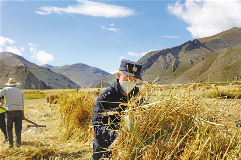 近日,日喀則市康馬縣公安局在統籌安排好工作的同時,組織民輔警志愿者深入南尼鄉楚嘎村田間地頭,幫助缺勞力家庭開展秋收。在豐收的田野上,民輔警志愿者分工明確,有的用背負式收割機收割,留下一排排青稞茬;有的將成熟的青稞捆扎,堆積成一排排青稞垛子,進行晾曬;有的忙于收集青稞穗,不浪費一粒糧食。