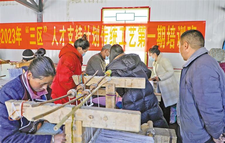 近日,山南市洛扎縣組織25名學員,采用理論與實操相結合的方式,舉辦了2023年“三區”人才支持計劃傳統工藝第一期培訓,現場教授學員學習卡墊織造技藝。
