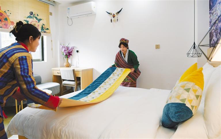 圖為林芝市墨脫縣背崩鄉巴登村村民在民宿中整理床鋪。記者 洛桑 攝