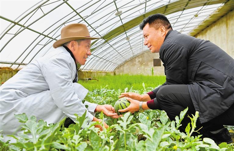圖為措勤縣農牧業技術推廣站站長吾金次仁(右)和措勤縣高原生態畜牧業現代化養殖一體化產業綜合基地合作社負責人扎西桑布在西瓜大棚里交流。 新華社記者 張汝鋒 攝