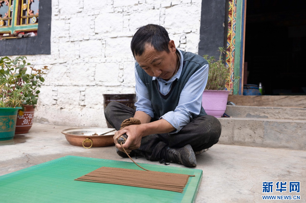 工作時,格桑次仁會盤腿坐于門前,熟練地揉搓著盆中的香泥,待其成型后再迅速放入帶孔的牛角中,用靈巧的手指擠出一道道筆直的線條,一根根均勻的藏香便呈現在人們的眼前。經過晾曬成型之后,這些藏香將會被送至附近的大小寺廟,或是通過電商渠道發往全國各地。