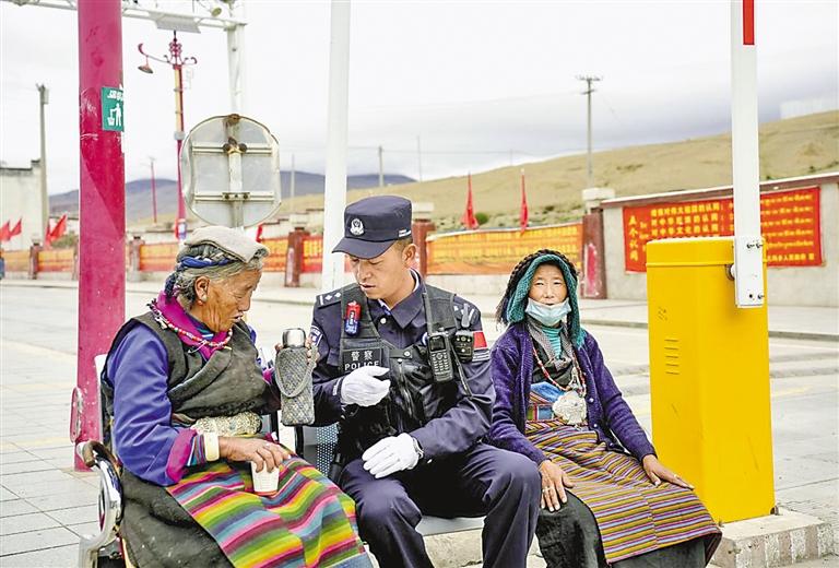 圖為曲崗邊境檢查站民警在巡邏途中與路邊休息的老人交談。 記者 趙文慧 通訊員 巴桑頓珠 白瑪倉覺 攝