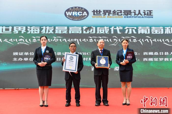 23日,經(jīng)世界紀(jì)錄認(rèn)證(WRCA)官方人員現(xiàn)場(chǎng)審核,西藏桑日縣被認(rèn)證為“世界海拔最高的威代爾葡萄種植基地”。