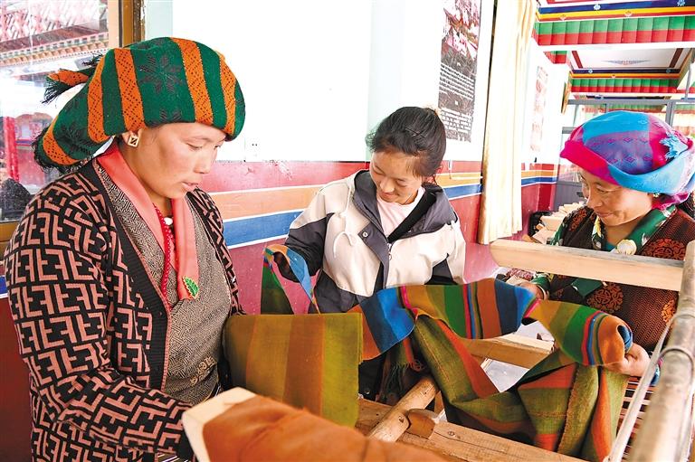 圖為日喀則市仁布縣康雄鄉(xiāng)亞德細褐羊毛織品農民專業(yè)合作社的編制能手在傳授編制技藝。記者 李洲 攝