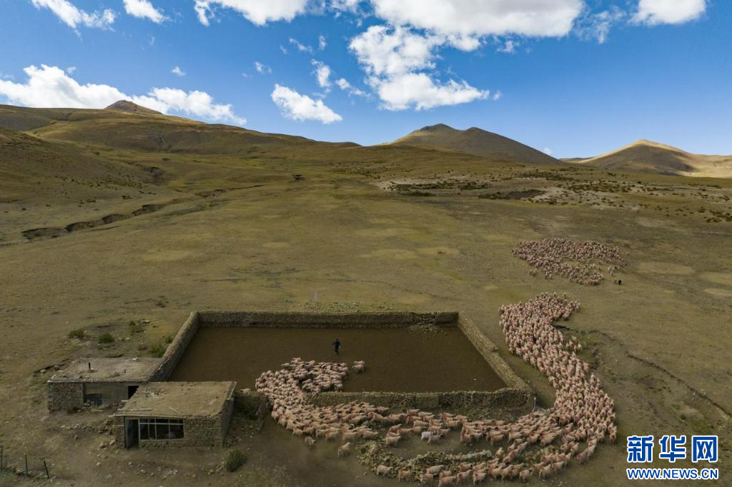 扎西松多村集體養殖的千只綿羊(無人機照片)。新華網 旦增努布 攝
