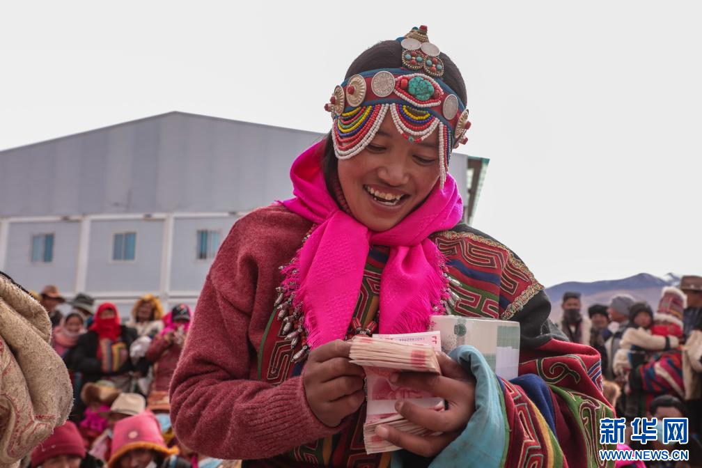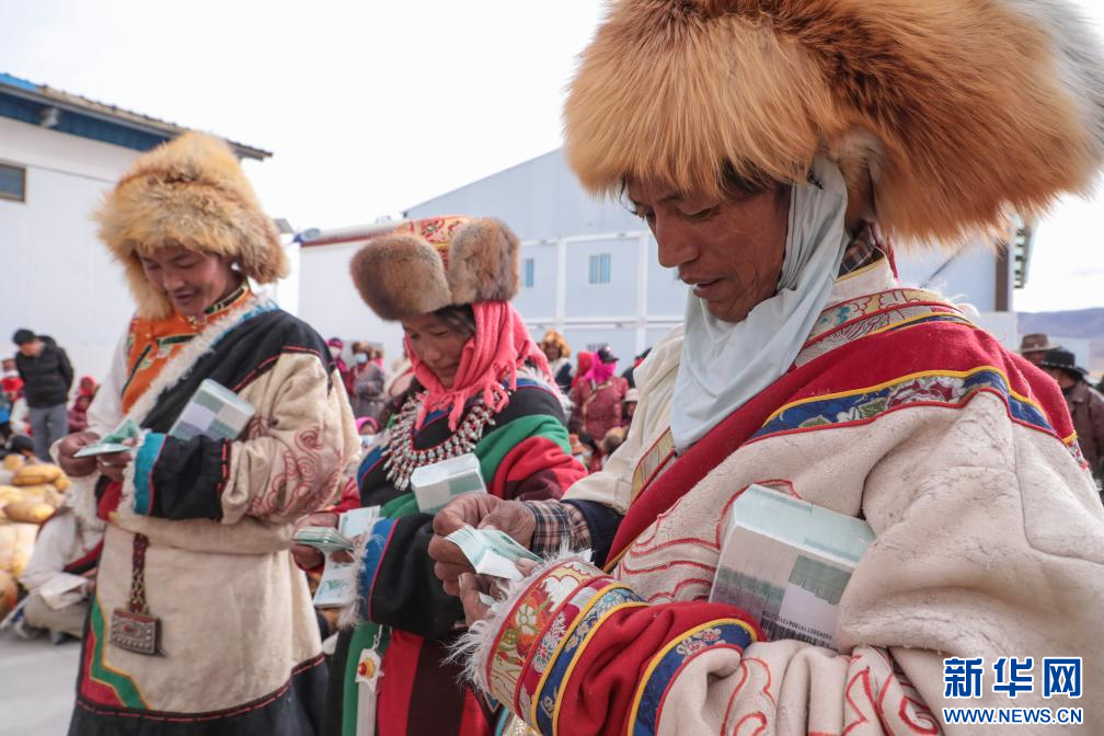 合作社社員領到現金分紅(11月28日攝)。新華社發(索朗仁青 攝)