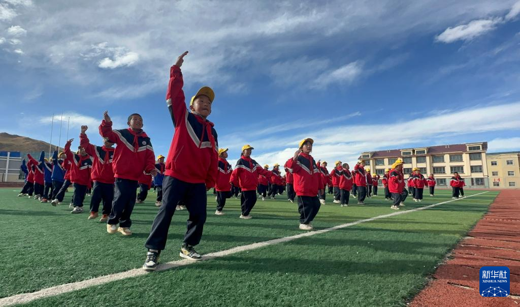 10月13日,在西藏那曲市班戈縣中石化小學(xué),學(xué)生在操場上跳“班戈諧欽”課間操。新華社發(fā)(孔琳琳 攝)