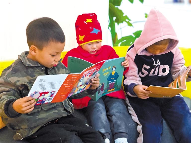 扎拉村的孩子在新時代文明實踐志愿服務隊成員的輔導下閱讀藏文繪本。